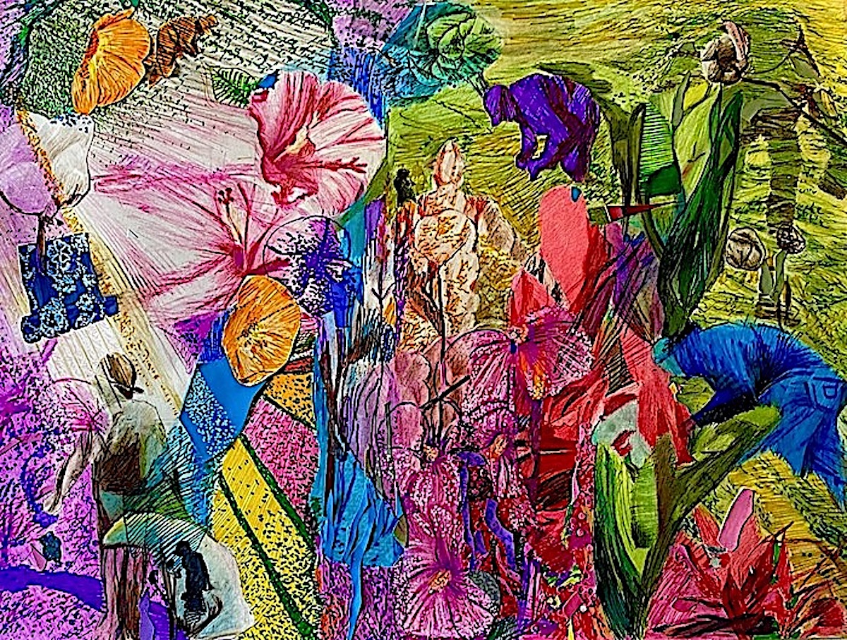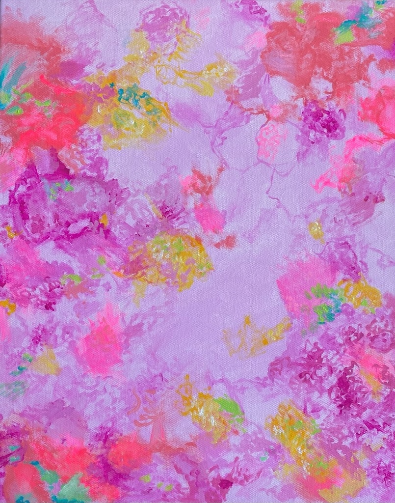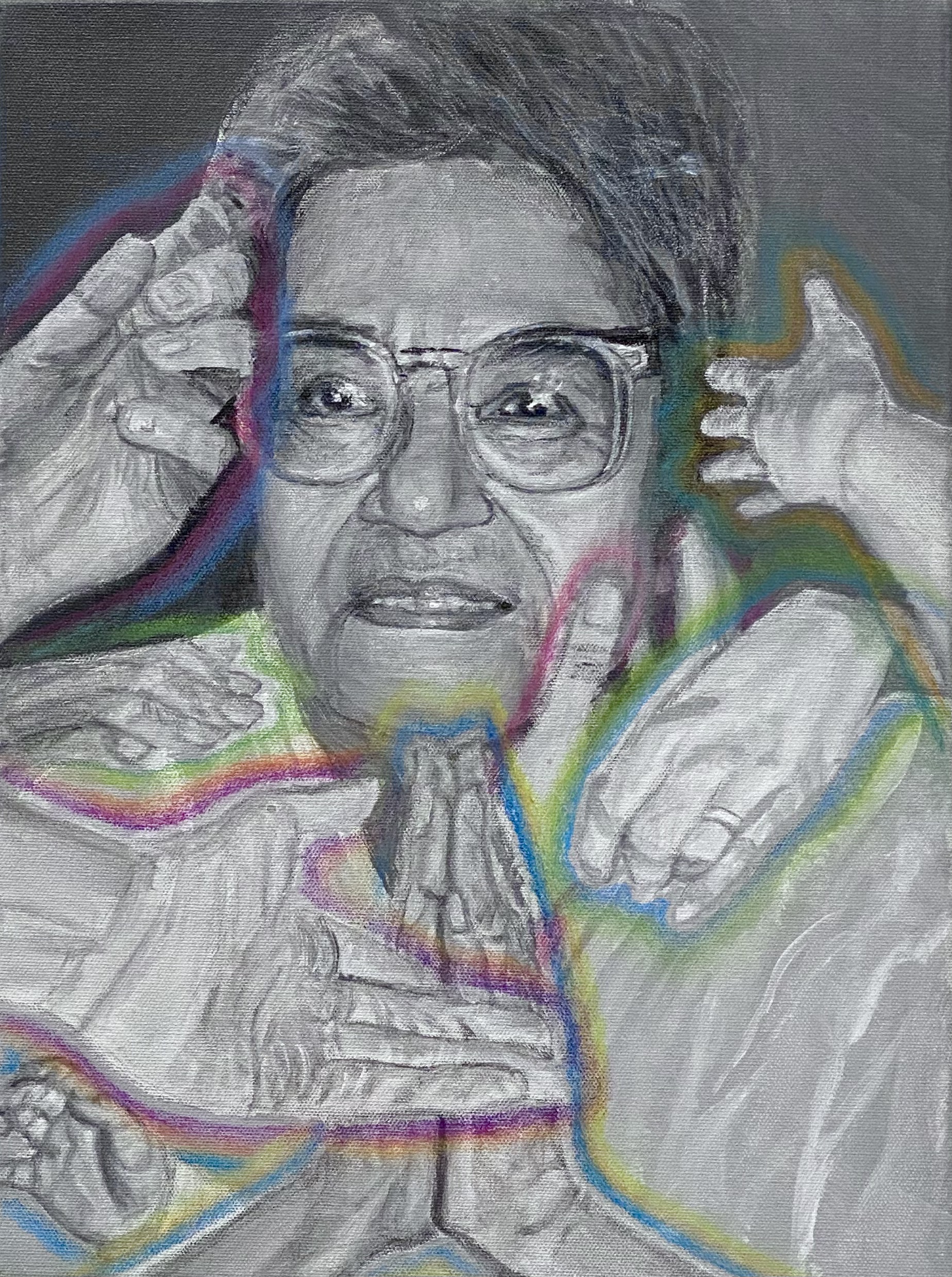 Bloom captures breaking down the realistic associations of florals through ideas of a flower’s purest qualities. Pink, yellow, and purple hues capture Spring- time florals. Such colors portray warmth; physical and emotional, wonder and growth. Small weblike lines came from inspirations of flower petals down to microscopic views. Whereas, smoke like color deposits capture the soft and environmental qualities of floral scents. While the flower form tends to be mostly symmetrical, this piece resists symmetrical bounds with its’ free flowing composition. Exterior had inspirations from a blank slate of uncharted territory when a home is something one has to redefine. The thick piles of paint are applied to the surface to mimic stucco, exterior walls of a home, and traces of topographic features from memory. The slightest inconsistencies of monochromatic hues represent an imperfect, intellectual experience of color memory. These piles are messy and organic which represent the confusion and uncertainty in the mind when one is displaced from their home. A continuation of Exterior. The minimal inconsistencies of color represent the flawed intellectual memory of color in Bedroom. This piece is on a smaller supported canvas to communicate a more intimate gaze, one that invites the viewer in for a closer look because of its’ size. Such intimacy with this painting’s size is significant because this color describes an emotional, personal memory of my bedroom. A memory which is deeply individualistic and private. This truest representation of the exact color in this bedroom are only known by a few.This reinterpreted space represents the act of searching for a home intellectually in Searching. Thin piles of concentrated textures of paint describe ongoing trains of thoughts per second. Abstract fields of color depict the vastness of the outdoors when one is displaced from their home and is in search for a new home. In addition,, small inspirations of car lights in aerial freeway patterns and city lights were represented by traces of bright colors. Bright and desaturated colors represent the gains and absences of memory in an active search for a new home.The culmination of dark and light hues are simultaneous fields of clear and obscure layers which represent feelings of the unknown when in search for a home in Vast Outdoors. These colors of paint are both desaturated and saturated to describe exterior spaces such as the vast outdoors of various landscapes. The hue choices came from ideas of different times of day in the outdoors.Behind the Linage: Agricultural Workers shows abstracted identities of farm workers/ the exploration of labor behind a bouquet of flowers to the universal tee shirt. Farm workers are tirelessly overworked and underpaid. Flowers in the mallow such as cotton, hibiscus, cocoa, and okra have an important cultural history in the world’s consumerism today.This piece was inspired by the yearning I have when thinking about my abuelita (grandmother). Her passing was deeply heartbreaking and life altering for me. She was the only grandparent who helped raise me because of this, she was the only grandparent I was close to. The hands symbolize the idea that she is physically out of touch but the notion that my family and I constantly yearn for her presence or aura back. The sense of yearning is still deeply, emotionally present to this day. I chose to depict different family members hands to illustrate the wide impact she still has on our family from the smallest grand child to her eldest adult child. I drew orbs of color in pastel to illustrate the various people wanting her back with us. We like to keep her memory alive through repeating little sayings of her’s, cooking, and bringing her up in conversations. I wanted to keep, not only how I physically remember her alive, but depict the different lives she had a deeply emotional impact on throughout her lifetime.